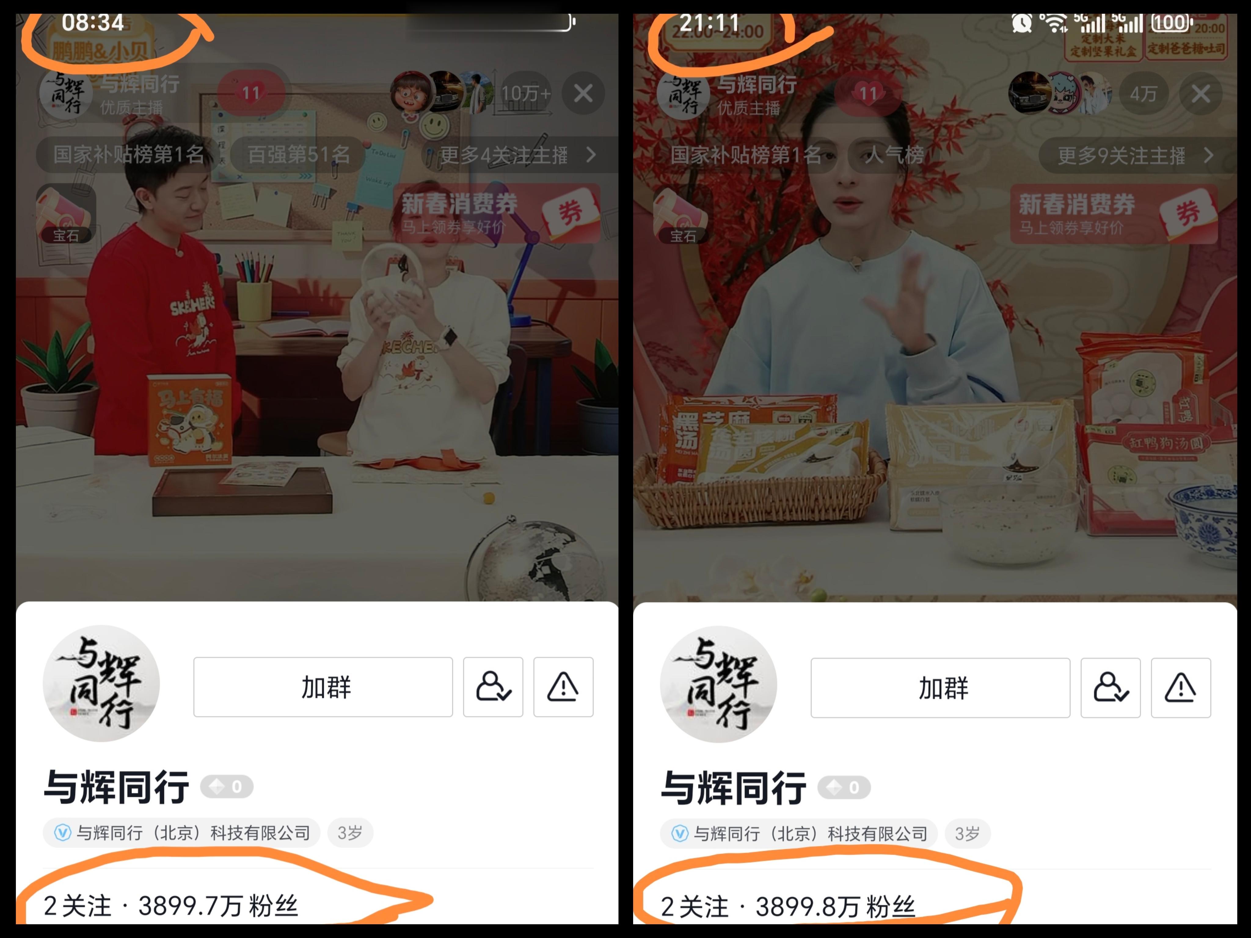 但在这些亮眼数据的背后,还有一个比较重要的数据却表现的有点拉胯,那就是涨粉数据,昨天早上开播前“与辉同行直播间”的粉丝数量是从年前的3910.9万降到了3899.7万,因放假14天导致掉粉了11.2万。原本以为昨天开播后,会有一个比较快速的涨粉,但想不到昨天播到晚上21点多后,直播间的总涨粉数字才从3899.7涨到了3899.8,开播10多个小时才涨粉1000人,这个涨粉速度对比之前一天少说涨粉几万的时候,可就显得比较不给力了。