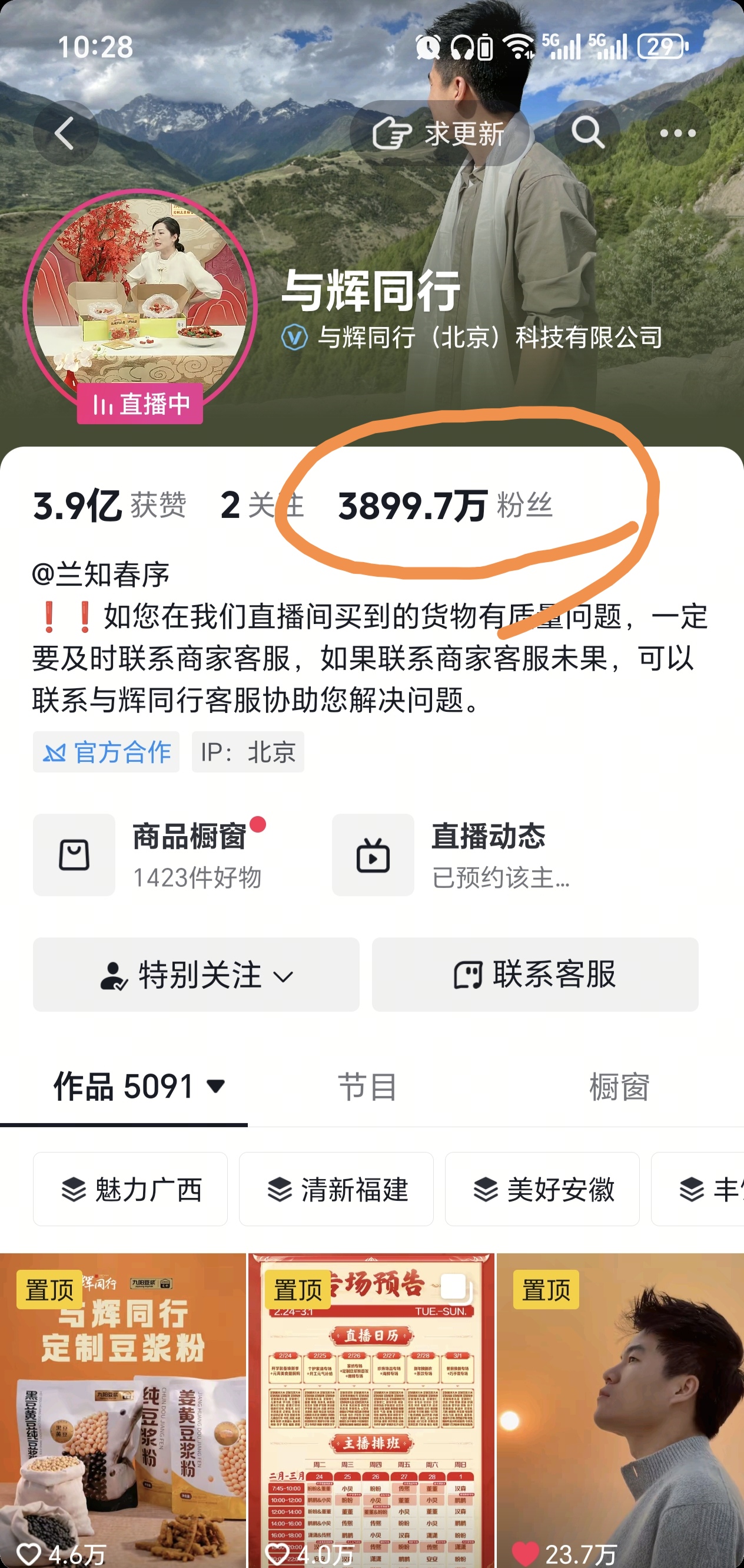 等今天25号早上去打开“与辉同行直播间”时,却发现昨天涨的1000新粉竟然又没有了,因为账号粉丝数量又跌会3899.7万,这就比较奇怪了,开播涨粉后的粉丝数量还会下跌回去,这在“与辉同行”可是不常见的,可见新年开工首日的涨粉数据是比较异常的,看看今天会不会表现的比较好些。