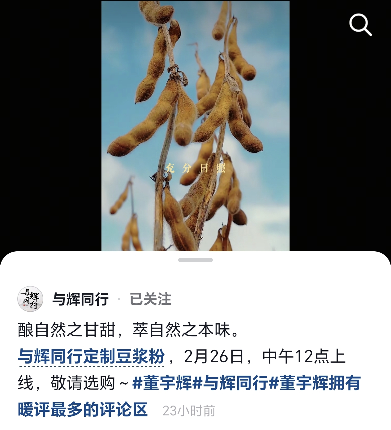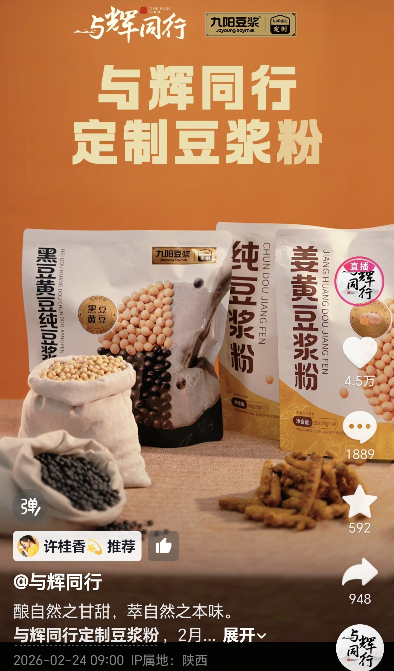 昨天24号与辉同行小编还给大家官宣了一个喜讯,那就是与辉同行有一款新的定制品要首发上市了,这款新定制品就是豆浆粉,通过去年先后推出的10多款定制产品都爆卖后,定制产品已经被宇辉团队打造成了直播间的热卖爆品,特别是定制吐司,那更是一袋难求,所以相信这款明天26号中午12点首发上市的“定制豆浆粉”也一样会爆卖,让我们拭目以待!