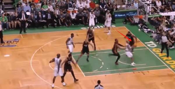 先是阿伦突破东契奇 可以看到其实东契奇并没有完全被过掉 把持球人放进内线让拉拉维亚来协防,类似于夹汉堡一样把进攻人夹住,没有问题。