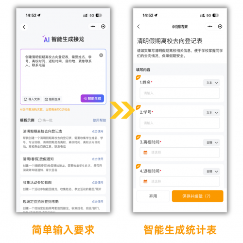 今年清明假期,试试用接龙管家统计大学生假期离校去向!30秒自动生成离校去向Excel表,告别手动整理,高校信息统计更轻松!