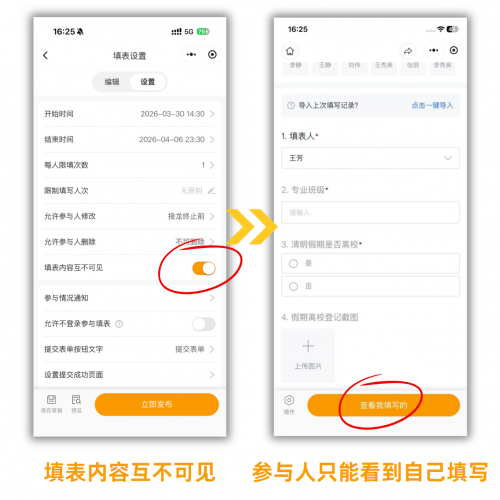 开启“填表内容互不可见”后,每个学生只能看到自己的填写内容,看不到其他人的信息。家庭住址、联系电话这些隐私数据,再也不用担心被全班同学看到了。