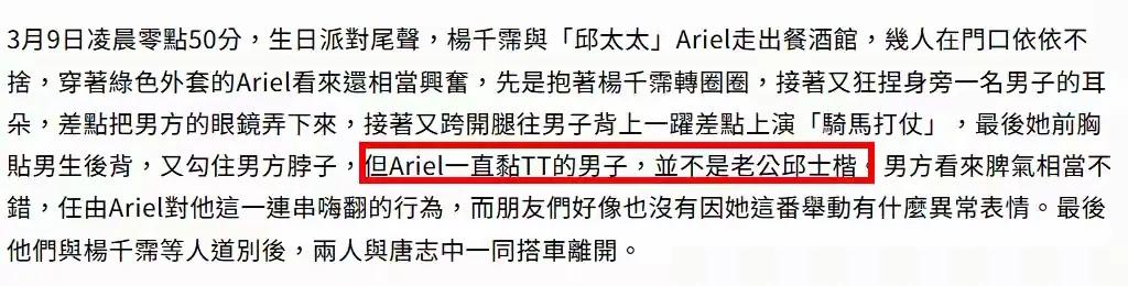 很多网友都认为,以Ariel的身份和认知来说,不应该大庭广众之下,与异性做出此等越界举动,难道她和邱士楷感情生变?