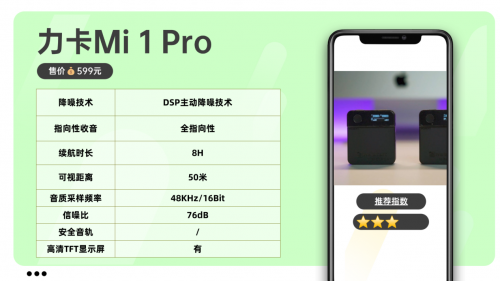 力卡Mi 1 Pro以专业配置适配创作需求,33.2g发射器搭配弹力背夹,夹在西装或摄影马甲上稳固不晃。配件丰富到贴心,MFi转接头、相机/手机专用线一应俱全,手机、单反即插即用,开机2秒自动配对,OLED屏清晰显示电量与信号,小白也能快速上手。