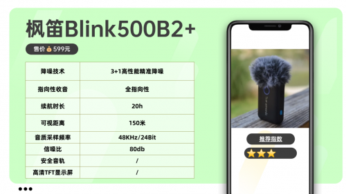 枫笛BlinkMe主打全触屏创新与双人收音,30g发射器配磁吸背夹,贴衣领稳固不勾面料,隐蔽性强。一拖二套装含双接口接收器,手机、相机即插即连,APP可自定义屏幕壁纸,博主录制时能融入品牌元素,OLED触屏清晰显示电量与信号,操作直观易上手。
