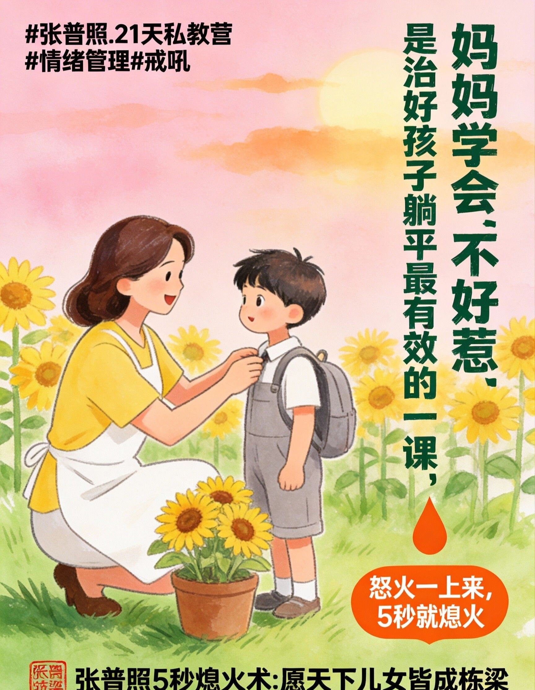 张普照5秒熄火术,就是帮你夯实地基、获得真正力量的根本方法。在你即将被孩子的“躺平”激怒,准备用吼叫、冷脸等“纸老虎”方式去恐吓他的 那个5秒,帮你 将即将喷发的无用怒火,瞬间转化为沉静笃定的内在力量。