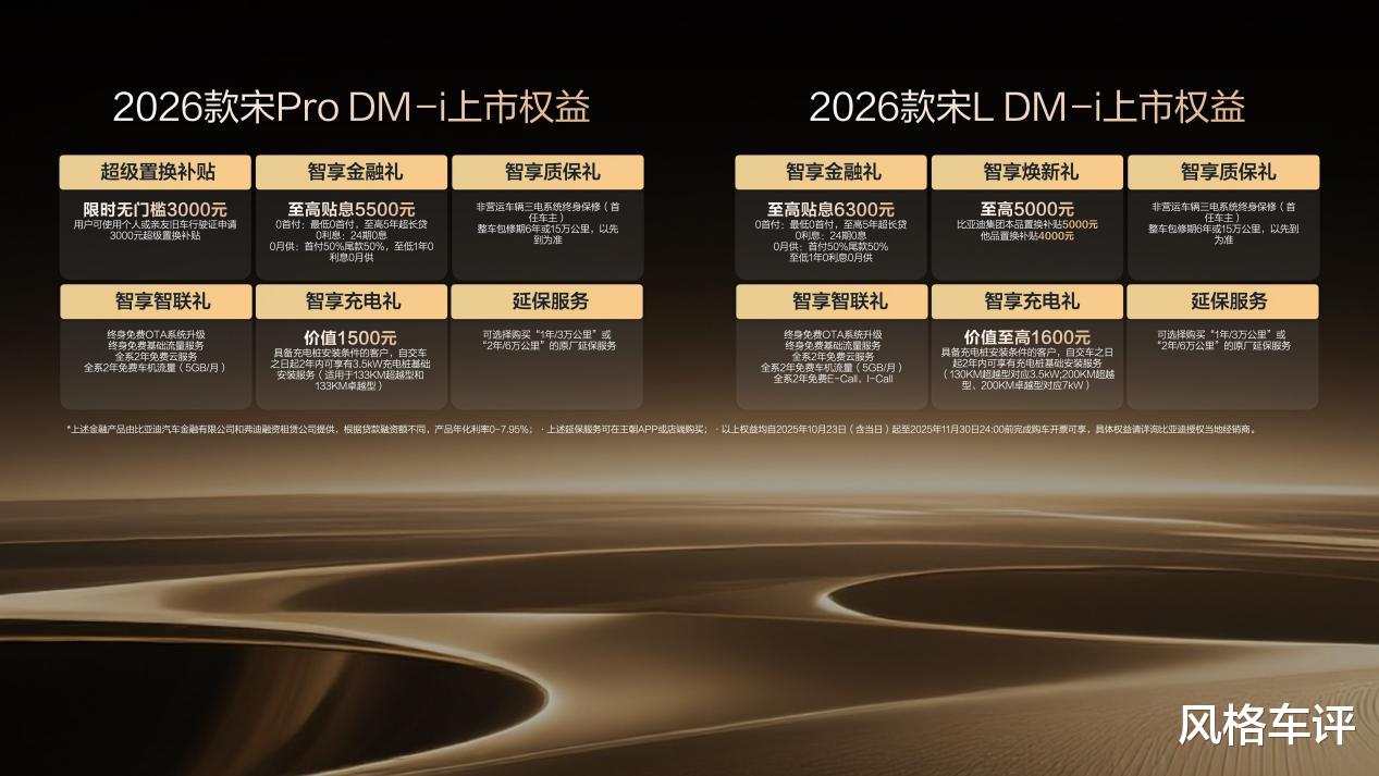 其中,2026款宋L DM-i售价13.98-15.68万元,2026款宋Pro DM-i超级置换权益后,限时售价9.98-12.28万元。同时,两款车型均带来了丰厚的上市权益礼。