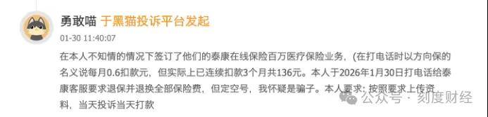 从黑猫投诉的共性案例来看,泰康在线的套路已形成完整产业链:以第三方平台为流量入口,用0.6元、1元等超低价诱饵降低用户警惕,通过默认勾选投保协议、违规代扣完成隐蔽操作,再以高额续期费用持续收割,最后通过与合作方推诿、拒绝提供核心凭证、调解失败等方式阻断维权。