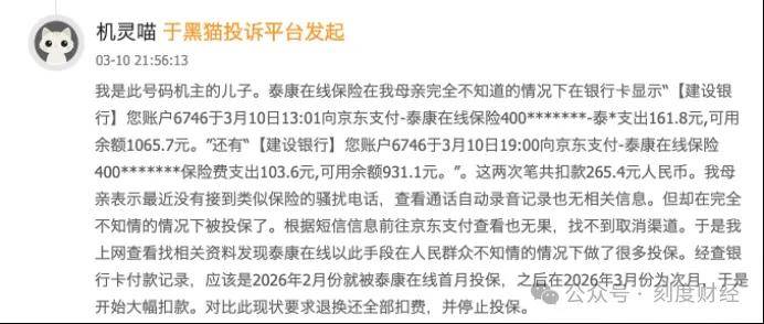 有用户母亲全程未接到泰康在线的推销电话,查看通话自动录音记录也无相关信息,却在2026年2月被莫名投保,3月10日连续被扣161.8元、103.6元两笔保费,扣款渠道显示为“京东支付-泰康在线保险”,用户前往京东支付端却找不到任何取消投保的渠道。