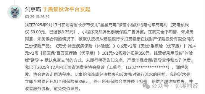 有用户在2025年9月13日使用长沙“星星充电”微信小程序充电时,仅看到平台弹出的泰康保险广告,既未点击同意也未阅读合同,就被默认授权扣费,其中《无忧·特定疾病保险(体验版)》0.6元×2笔、《无忧·重疾险(优享版)》76.4元×2笔、《超医保·百万医疗险(优享版)》101元×2笔,累计被扣356元。