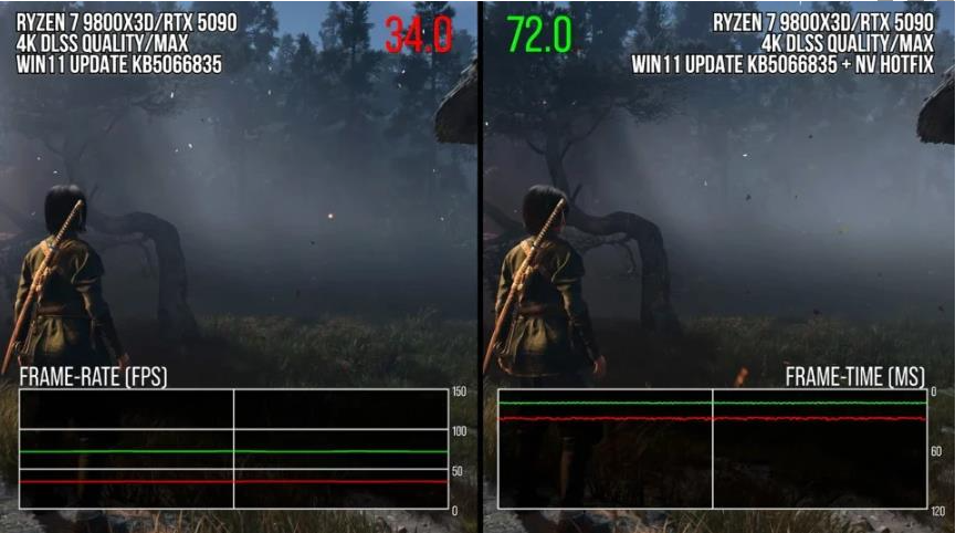 多家媒体和测试机构发现,安装该更新后,部分游戏的性能出现明显下降。例如,在配备锐龙7 9800X3D CPU和NVIDIA RTX 5090显卡的电脑上测试《刺客信条:暗影》时,游戏性能下降了33%到50%。此外,《反恐精英2》也受到了影响,出现更多的帧率骤降和卡顿。