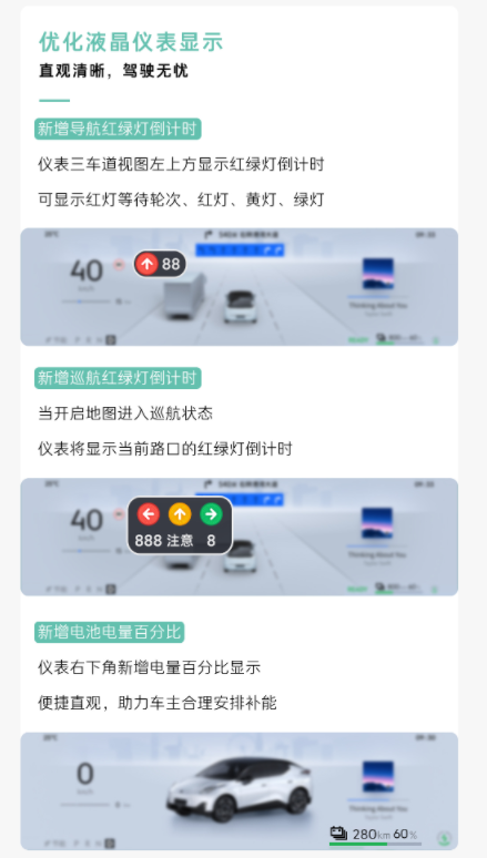 此外,行车信息显示与车辆控制体验也迎来了多项细节优化。液晶仪表新增导航红绿灯倒计时、电池电量百分比显示;HUD抬头智显补充了巡航红绿灯倒计时、绿波车速、目的地剩余里程与时间等关键信息,使驾驶者无需频繁低头即可掌握行车状态。车控车设方面,RPA泊车辅助逻辑进一步完善,方向盘自定义按键新增双击指令,氛围灯亮度调节更加细致,地图导航音量记忆更加贴合使用习惯,整体操作流程更加顺畅自然。