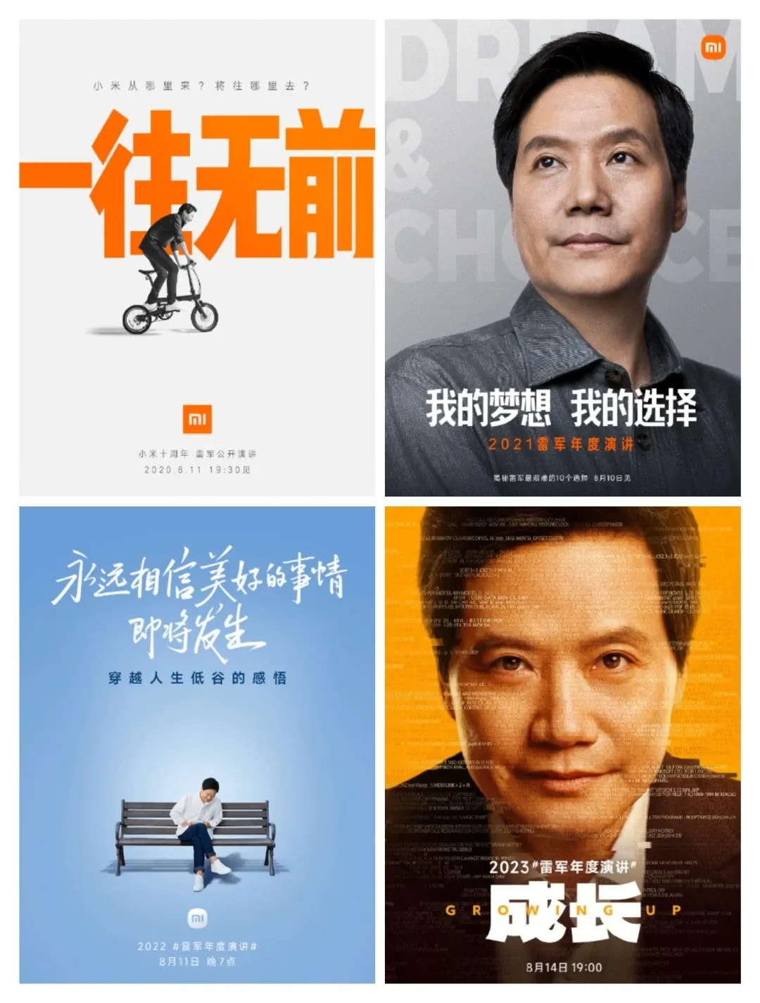 单以今年雷军年度演讲的一张海报为例。今年雷军年度演讲的主题是改变,小米对外发出的一张海报宣传语是:“造车的同时,重启造芯,同时供两个孩子上大学,哪来的勇气?”