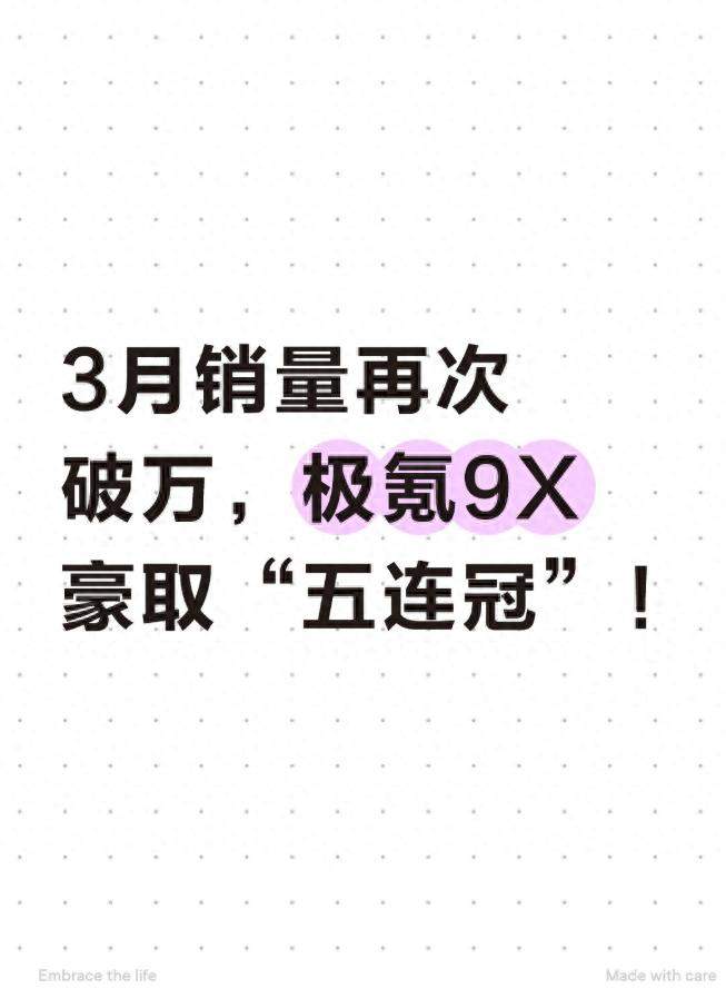 从去年11月开始第一次成为50万以上大型SUV销冠,到今年3月销量再次破万,成为榜单TOP1,极氪9X已豪取“五连冠”。