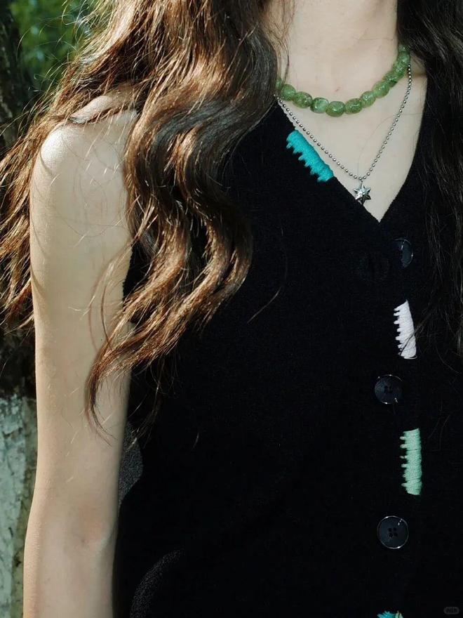 穿搭2:黑色马甲+碧绿半裙+玉石串珠