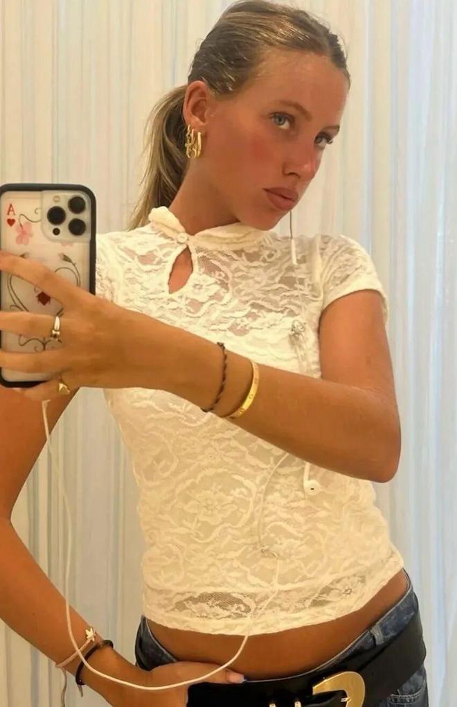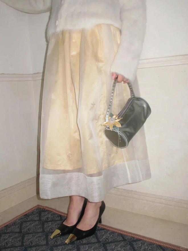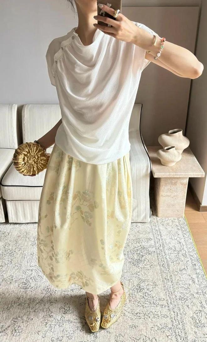 穿搭5:白色荡领上衣+黄色薄纱半裙