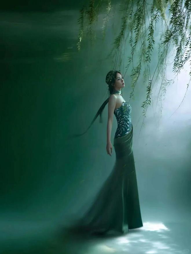 上半身的纱织罩衫要有筋骨,下搭缎面鱼尾裙,娇媚却不艳俗。