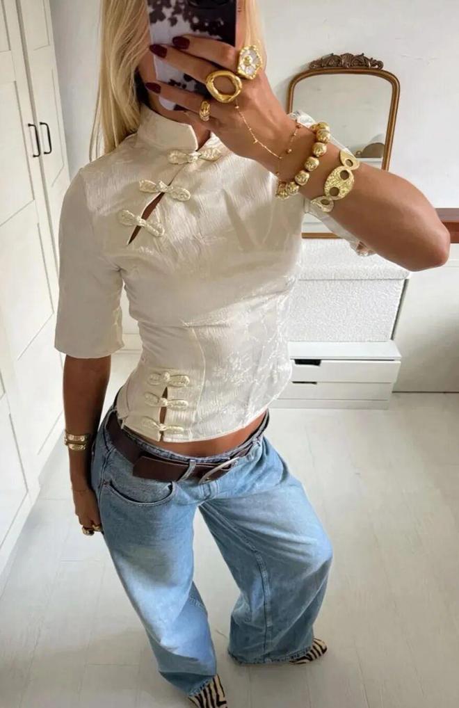 褪去复杂纹样的简约,是提取中式精髓的巧思:可能是一件带盘扣的棉麻衬衫,宽松舒适适配通勤。