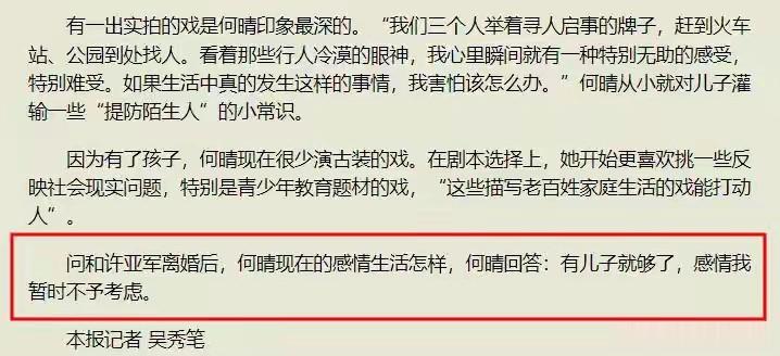 其实何晴这一生就一婚,并育有一子。了,和许亚军离婚后也没有再婚。