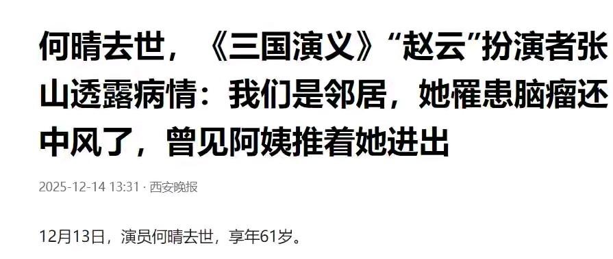2025年12月13日,61岁演员何晴因病离世的消息被各大媒体报道,就像5月份送别朱媛媛时一样满是难过与惋惜。