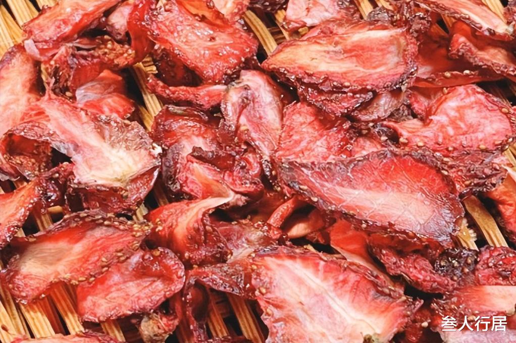 自然晾晒:将腌制好的草莓片均匀铺在竹筛上,避免重叠,然后放置在阳光充足、通风良好的地方晾晒。根据天气情况,一般需要2-3天时间,期间需不时翻动草莓片,确保均匀干燥。