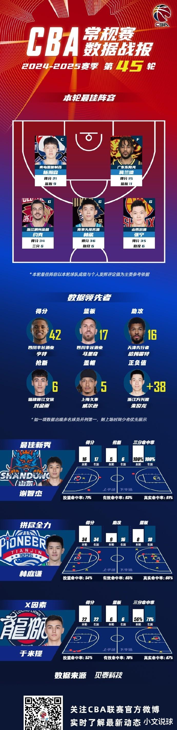 青岛队的杨瀚森内线统治力十足,篮下进攻精准高效,成为球队获胜的关键;广东队的莫兰德依旧是球队内线的支柱,篮板球和内线防守都非常出色;浙江队的约克外线火力全开,三分球命中率极高,成为对手难以防守的点;南京同曦队的林葳突破犀利,组织能力出色,带领球队打出了精彩的比赛;山西队的张宁则展现了全面的技术和稳定的发挥,成为球队进攻端的核心。这五位球员代表了本轮比赛的最高水平,他们的精彩表现值得我们铭记。