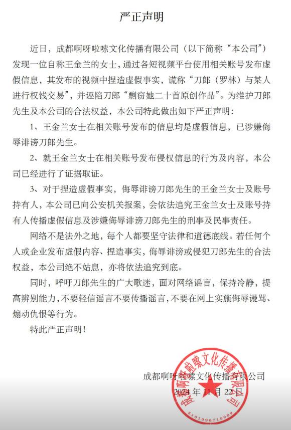 公司在自己的官方账号发布了一则严正声明,明确指出王金兰所发布的所有信息均为虚假信息,其行为已涉嫌对刀郎的侮辱诽谤。