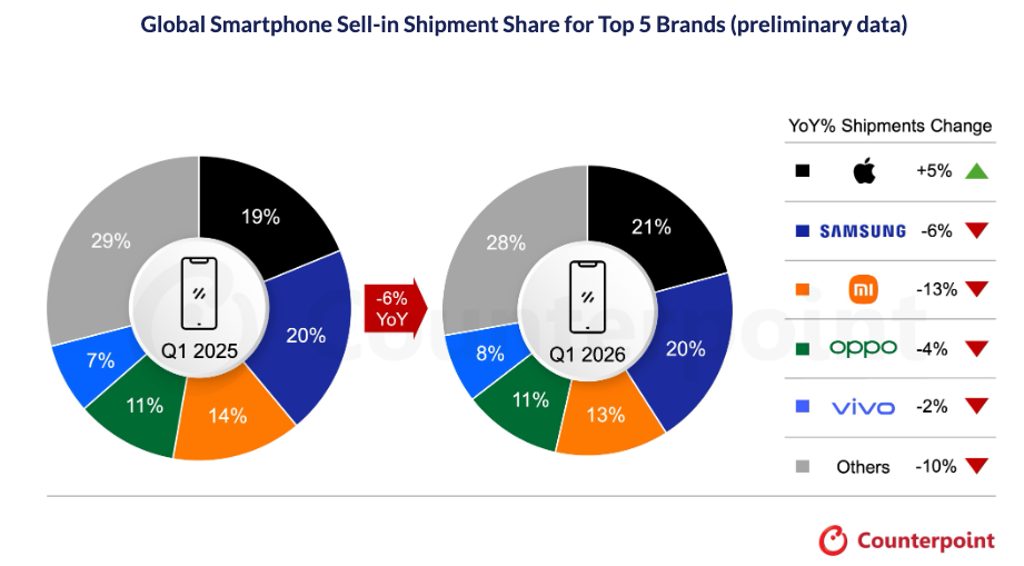 在此背景下,苹果公司表现突出,以21%的市场份额首次在第一季度登顶全球市场,出货量同比增长5%。报告分析认为,这主要得益于iPhone 17系列的强劲需求,以及苹果在内存短缺危机中展现出更强的供应链韧性。其高端市场定位和积极的以旧换新计划,帮助其在一定程度上抵御了行业下行压力。