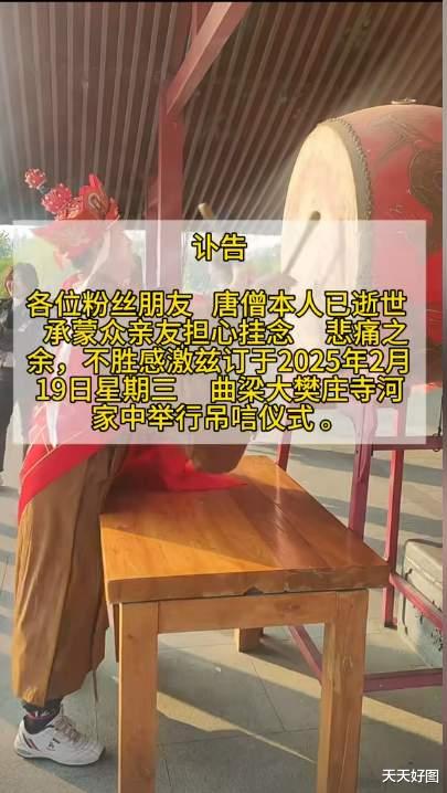 直到昨天晚上九点,他的个人视频账号发布了一则讣告,“唐僧”本人已逝世,承蒙众亲友担心挂念,悲痛之余,不胜感激,兹订于今天在曲梁大樊庄寺河家中举行吊唁仪式。