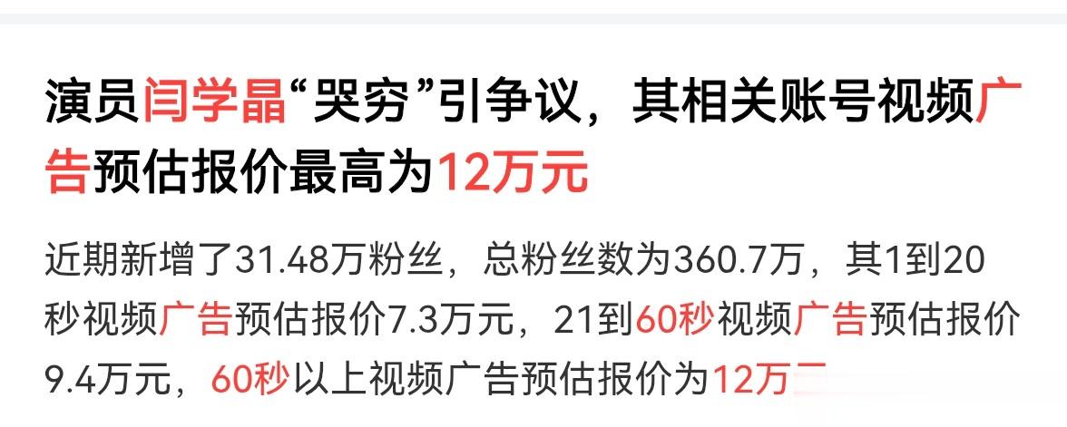 闫学晶自己接一条60秒广告就能赚12万。