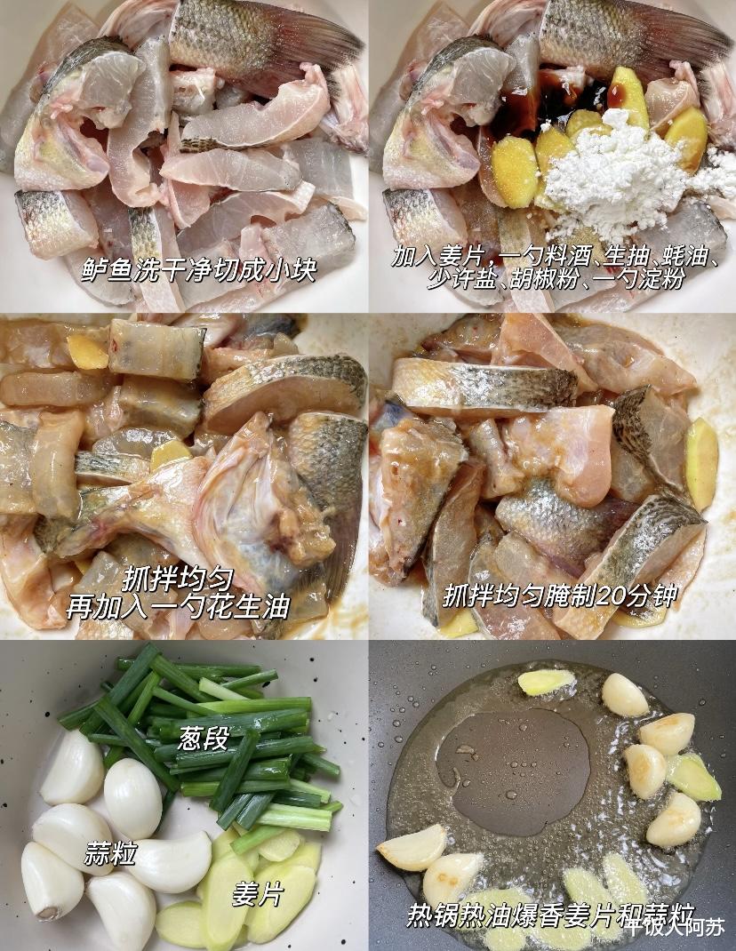 腌制是赋予鲈鱼灵魂的重要环节,也是这道菜好吃的核心技巧之一。将切好的鱼块放入碗中,加入几片生姜、一勺料酒、一勺生抽、少许蚝油、一点盐和胡椒粉。这些调料不仅能有效去除鱼腥味,还能为鱼肉打下一个咸鲜的底味。抓拌均匀后,再加入一勺淀粉。淀粉的加入非常关键,它能在鱼肉表面形成一层薄薄的保护膜,锁住鱼肉内部的水分,保证煎出来的鱼肉嫩滑不老。最后,淋入一勺花生油抓匀,封住水分,腌制二十分钟。这一步“封油”的小技巧,能让鱼块在下锅时更容易散开,不粘连。