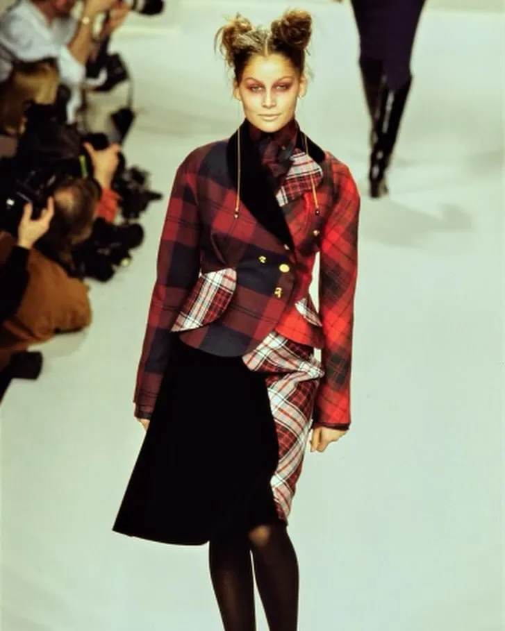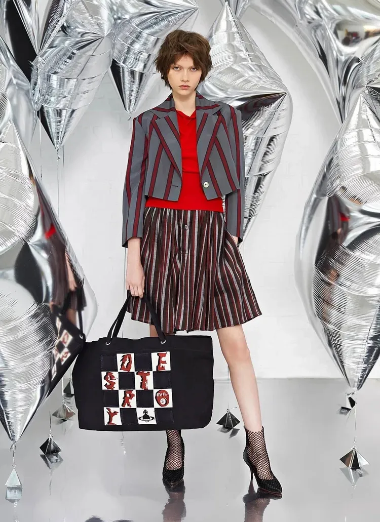 一些单品也以合作契机直接致敬了西太后的 archive 设计,例如格纹 Stormy 夹克是源于品牌 1996/97 秋冬「Storm In A Teacup」系列的经典款式。标志性的 Rocking Horse 厚底鞋也在漫画与动画中频频出现,来自于品牌 1987/88 秋冬的「Harris Tweed」系列,还有大崎娜娜演出上身的那件「Milky Way」T 恤,最早在 1990 年推出。