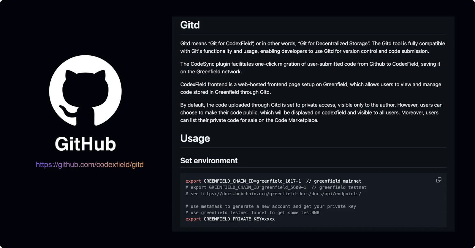 Gitd 的工作模式与 GitHub、GitLab 一致。clone、pull、push、branch、merge 等操作不需要任何迁移成本,创作者可以以熟悉的方式进行协作与提交。而所有内容最终存储在 Greenfield 这一去中心化数据网络之上,每一次提交都生成可验证的链上记录,与中心化平台相比天然具备抗冻结、可溯源与不可审查的特性。