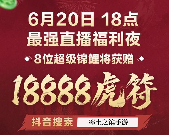 在游戏中的第一波活动火热进行时,率土也马不停蹄的端上了第二波福利——6月20日,率土官方直播间将下一场“虎符雨”,全程放送2000万虎符!过程中,官方还会持续抽取88、388、588、888虎符等奖励,如果有官方抽中的幸运玩家,还将成为超级锦鲤喜提18888虎符!