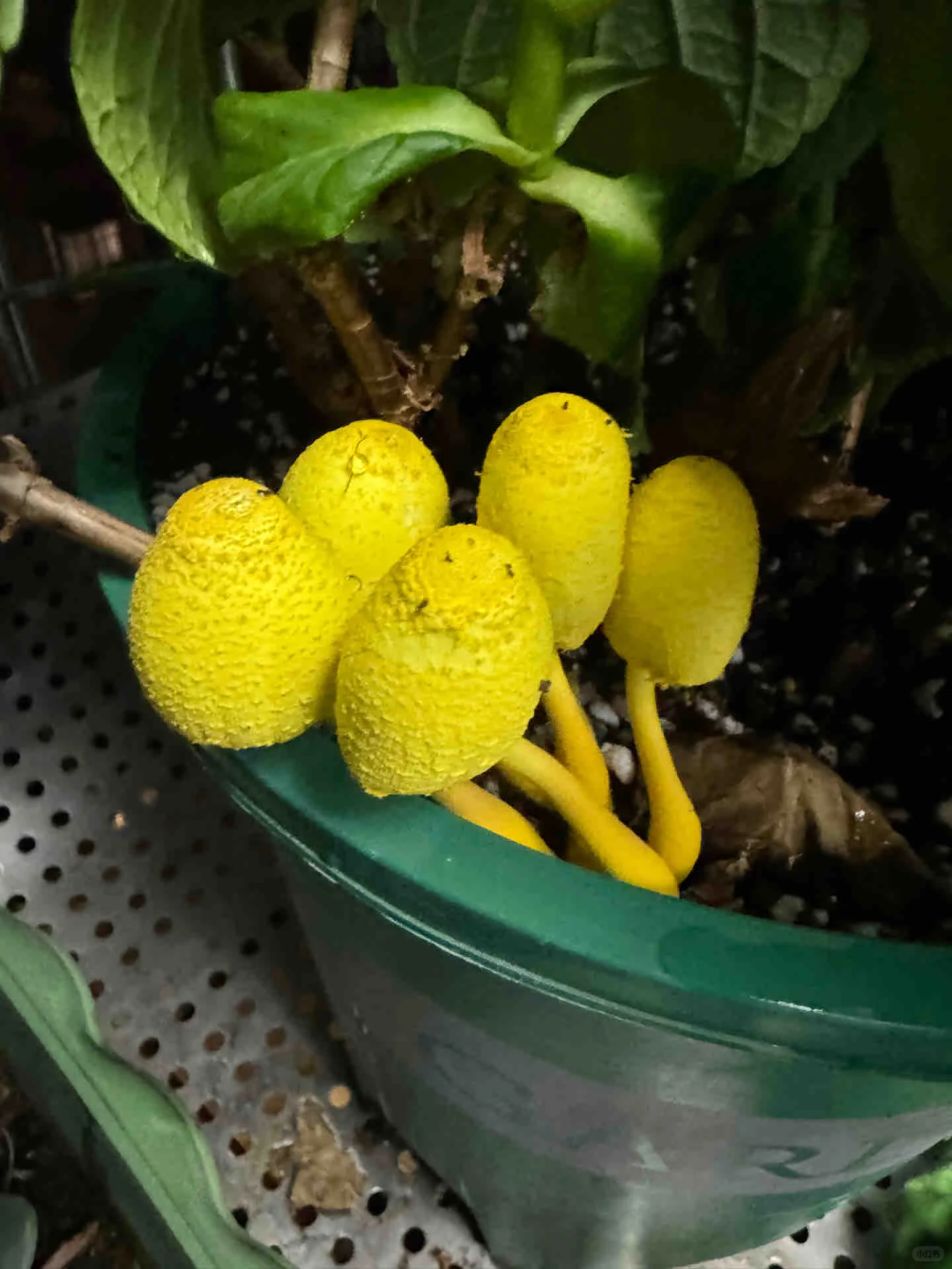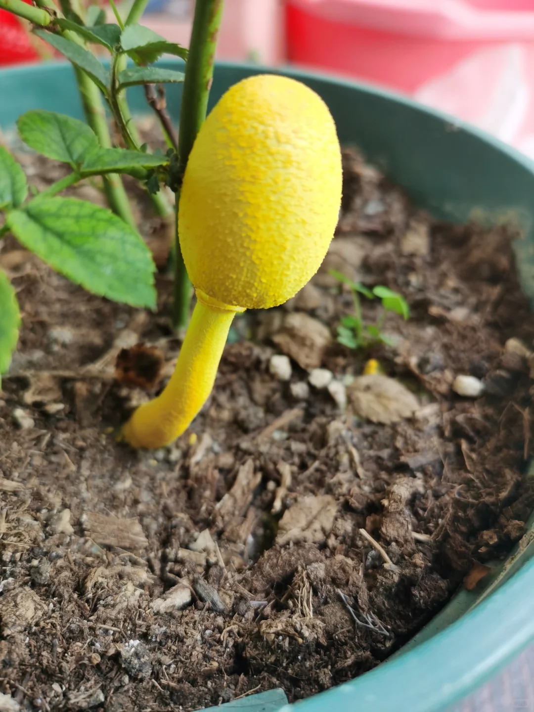 --几场大雨过后,花盆里突然长出了黄色的蘑菇,上网一查,好家伙,居然是一种名为“纯黄白鬼伞”的毒蘑菇,必须换盆换土,不然就只能等着月季慢慢死掉。