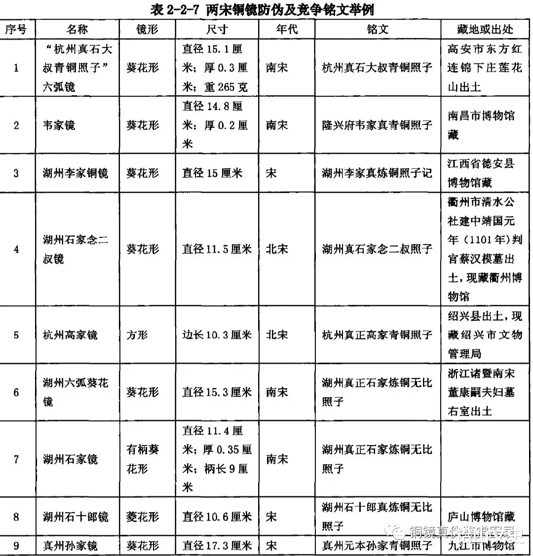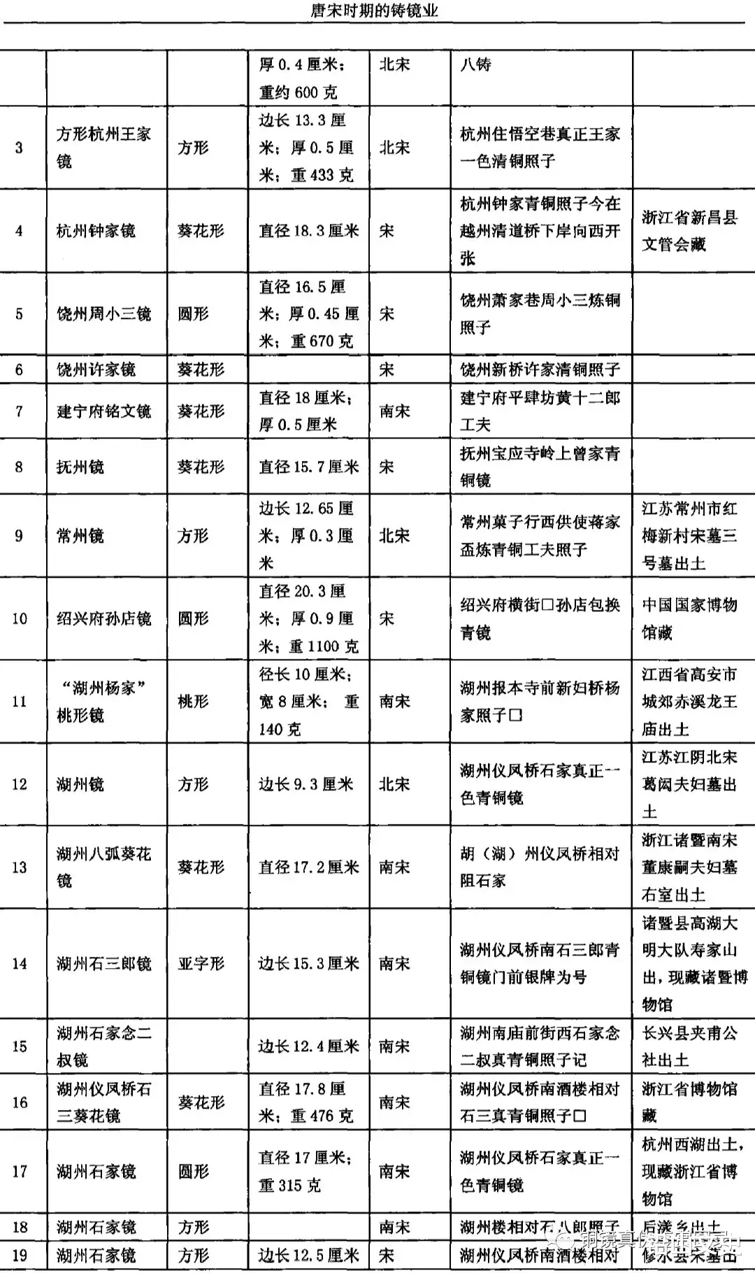 资料来源:邓宝生:《铜镜奇葩话建州》,《东方收藏》,2011年第11期;韩雪昆:《新疆博尔塔拉州出土的几件古代铜镜》,《文物》,1992年第1期;长沙市博物馆:《楚风汉韵:长沙市博物馆藏镜》,化京:文物出版社,2010年;张增午:《河南林州市出土古代铜镜》,《考古》,1997年第7期:王纲怀《三槐堂藏镜》,北京:文物出版社,2004年;潘表惠:《浙江新昌收藏的末代铜镜》,《考古》,1991年第6期;王士伦,王牧:《淅江出土铜镜(修订本)》,北京:文物出版社,2006年;肖锦绣:《江西省高安市博物馆珍藏铜镜》,《南方文物》,2005年第4期;四川省博物馆,重庆市博物馆:《四川省出土铜镜》,北京:文物出版社,1960年;孔祥星:《中国铜镜图典》,北京:文物出版社,1992年;何林《故宫藏镜》,北京:紫禁城出版社,2008年;吴水存:《九江出土铜镜》,北京:文物出版社,1993年;安徽省文物考古研究所,六安市文物局:《六安出土铜镜》,北京:文物出版社,200年:常州市博物馆:《江苏常州市红梅新村宋墓》,《考古》,1997年第1l期;江益林:《潮北麻城博物馆收藏的古代铜镜》,《文物》,1996年第6期;广西壮族自治区博物馆:《广西铜镜》,北京:文物出版社,2004年:王宁:《南宋南昌韦家铜镜》,《收藏家》,2009年第1期;张云土:《淅江“衢州徐卸五叔青铜照子”铭文镜》,《考古》,197年第5期;郑祖梅;《常德博物馆收藏的几件古代铜镜》,《文物》,1998年第10期;杨柱荣ε《馆藏铜镜选(六)》,《中国历史博物馆馆刊总第23期》,北京:文物岀版社,1995年;苏茂盛:《江西宜春出土南宋袁州铜镜》,《考古》,1995年第11期:范凤妹:《南昌发现宋代抚州镜》,《考古》,1989年第3期;王宁:《南宋赣州铸造的铜镜》,《收藏界》,2009年第1期;杨敏侠:《耀州窑博物馆馆藏铜镜》,《文博》,1996年第6期;宋康年:《安黴望江县博物馆馆藏铜镜简介》,《东南文化》,1991年第2期;龚德亮,杨海莉:《十堰市博物馆藏铜镜》,《江汉考古》,2009年第4期;栖霞县文化馆:《山东栖霞慕家店宋墓》,《文物资料丛刊(10)》,北京:文物出版社,1987年;李玉良,夏星南:《淅江长兴发现的几面南宋湖州青铜镜》,《东南文化》,1989年第6期;浙江省博物馆:《越地范金》,杭州:浙江古赣出版社,2009年;陈晶,陈丽华:《江苏武进村前南宋墓清理纪要》,《考古》,1986年第3期;陈柏泉:《宋代铜镜简论》,《江西历史文物》,1983年第3期;镇江市博物馆:《镇江未基》,《文物资料丛刊(10)》,北京:文物出版社,1987年;孙以刚:《江西德兴市宋乾道徐衎墓》《考古》,1995年第2期;龙腾:《蒲江县宋朝散大夫宋德章墓出土文物》,《四川文物》,1995年第2期:张英:《吉林出土铜镜》,北京:文物出版社,1990年;于少先:《德安县博物馆藏铜镜介绍》,《文博》,1993年第1期:刘志升:《孝感地区博物馆馆藏铜镜简报》,《江汉考古》,1990年第2期;安徽省文物学会,中国科学技术大学博物馆:《天下大明—中国历代铜镜展(下)》,《文物鉴定与鉴赏》,2015年第6期。