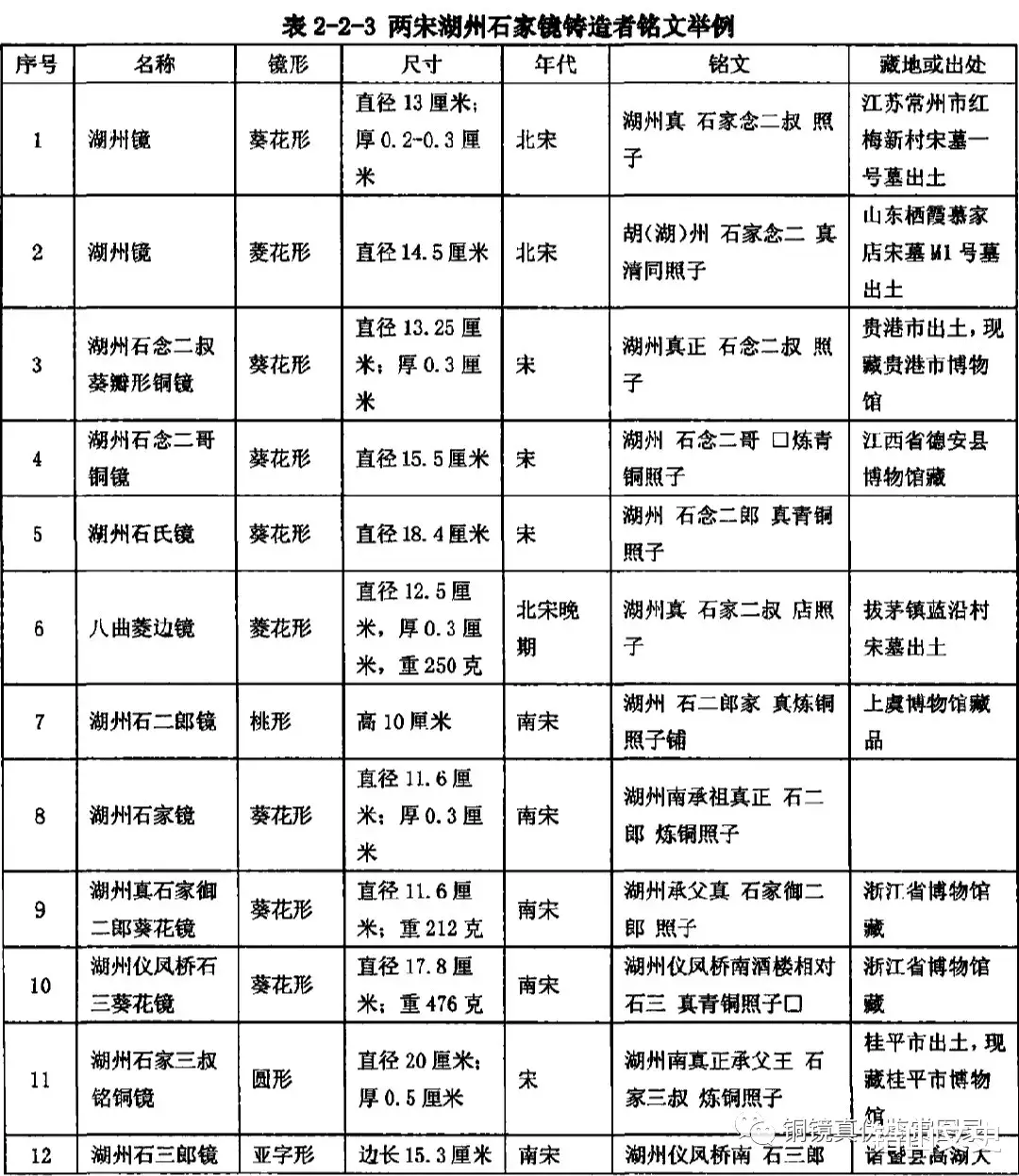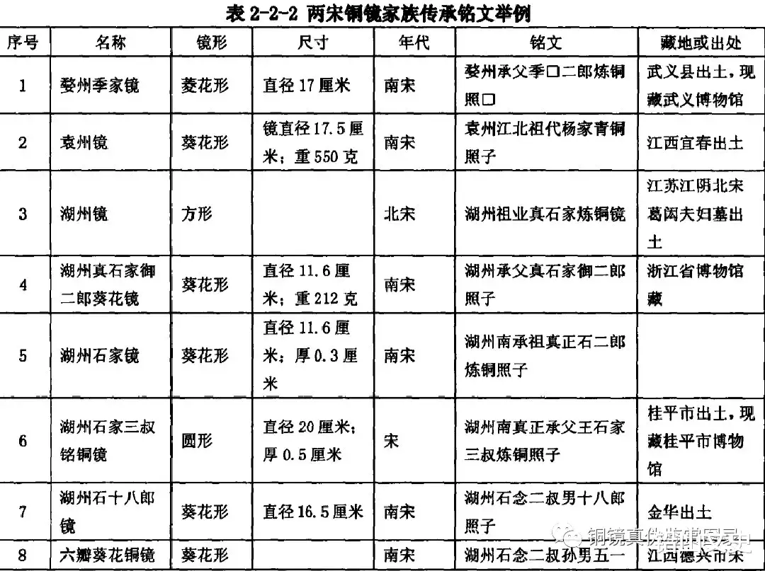 湖州铜镜是宋代铜镜大宗,湖州铸镜业之繁荣一直延续到明代。两宋时期的湖州镜中,以“石”姓铸造者最多,并以数字加“叔”、“哥”、“郎”来称呼,如“石家念二叔”、“石念二哥”、“石二郎”等(表223)。宋代男子一般称“叔”、“哥”、“郎”,女子称“娘”,数字则表示该男子在宗族辈分中的排行。宋代湖州石家镜是镜中大户,占据极大一部分铜镜市场,产品行销各地。有学者认为,由于市场竞争规则残酷,于是庞大的石氏家族中的铜镜铸造者们,开始以各自旗号展开了独立的创业征程。
