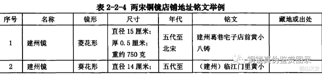 之后,也有扩大规模,在其他地方开分店,并告知分店地址的,如“杭州钟家青铜照子今在越州清道桥下岸向西开张”等。这些铜镜店铺多开在市镇繁华、交通便捷、人流量较大的街巷、桥边或寺庙旁,像建州“临江门”、杭州“悟空巷”、抚州“宝应寺”、常州“菓子行”、湖州“报本寺”、“南庙前街”、“仪凤桥”等,见表2-2-4。如铸镜作坊最多的湖州仪凤桥一带,紧挨苕溪,靠近湖州府衙及各类政府机构,周围店铺林立,十分热闹。为了避免消费者找不到地方,有些商家还会给自己的店铺做上标记,如“湖州仪凤桥南石三郎青铜镜门前银牌为号”。
