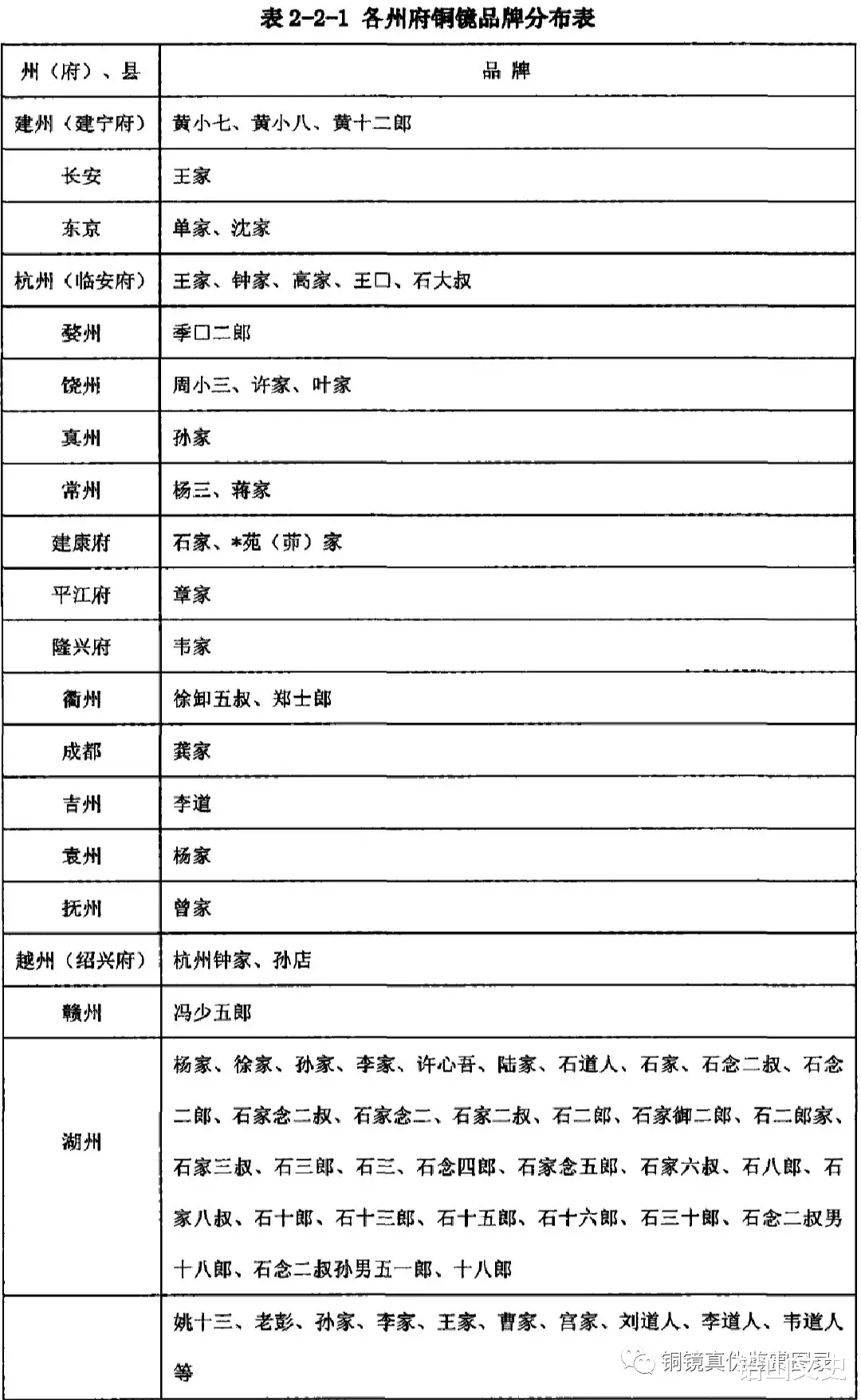 两宋时期商品经济发达,城市中各种各样的店铺林立,私营作坊比比皆是。宋代的手工业分工较之唐代更为详细,这些私营作坊往往只生产单一品种,专业性很强。较大规模的私营作坊还会雇用一定数量的工匠,形成宋代的手工业体系。随着商品经济的发展,各商家的自主产权意识变高,会给自己的产品打上自己的名号,以示其独一无二。宋代铜镜作坊一般会将自家的字号以铭文的形式刻在镜背上,并用双线框框起来,这种形式称之为“牌记”。通过对宋代铜镜牌记铭文的观察看来,铸镜作坊分布广泛,品牌众多(表2-2-1),这种现象反映了铜镜鲜明的商品化倾向和商业竞争趋势。