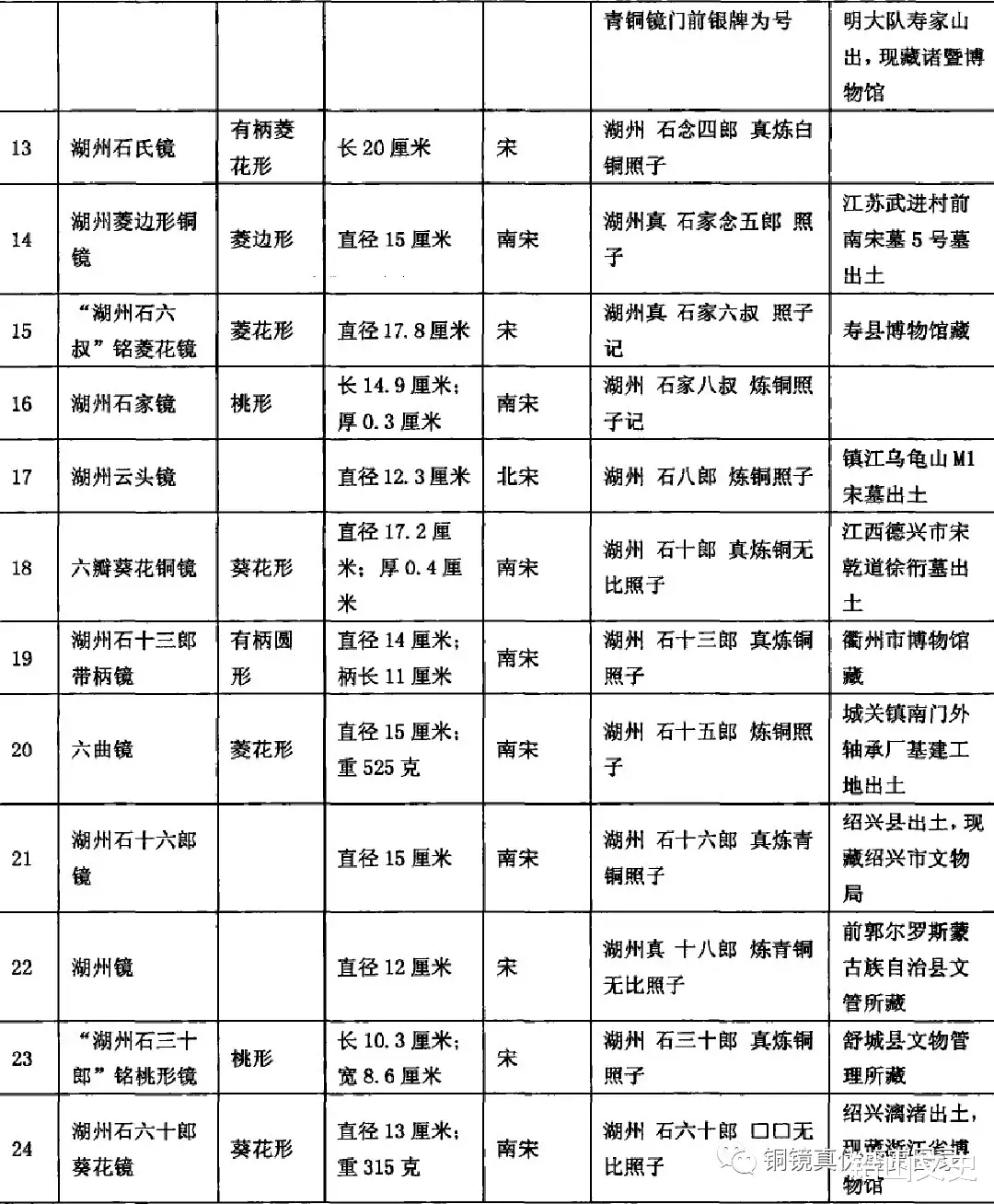 资料来源:1出自常州市博物馆:《江苏常州市红梅新村宋墓》,《考古》,1997年第11期:2出自栖霞县文化馆:《山东栖霞暮家店末墓》,《文物资料丛刊(10)》,北京:文物出版社,1987年;3,11出自广西壮族自治区博物馆:《广西铜镜》,北京:文物出版社,2004年;4出自于少先:《德安县博物馆藏铜镜介绍》,《文博》,1993年第1期;5,13出自四川省博物馆,重庆市博物馆:《四川省出土铜镜》,北京:文物出版社,1960年;6,20出自潘表惠:《浙江新昌收藏的宋代铜镜》,《考古》,1991年第6期;7,12,19,21出自王士伦,王牧:《浙江出土铜镜(修订本)》,北京:文物出版社,2006年;8,16出自李玉良,夏星南:《淅江长兴发现的几面南宋湖州青铜镜》,《东南文化》,1989年第6期;9-10,24出自浙江省博物馆:《越地范金》,杭州:浙江古籍出版社,2009年;14出自陈晶,陈丽华:《江苏武进村前南宋墓清理纪要》,《考古》,1986年第3期;15,23出自安徽省文物考古研究所六安市文物局:《六安出土铜镜》,北京:文物出版社,2008年;17出自镇江市博物馆:《镇江宋墓》,《文物资料丛刊(10)》北京:文物出版社,1987年;18出自孙以刚:《江西德兴市宋乾道徐衎墓》,《考古》,1995年第2期;2出自张英:《吉林出土铜镜》,北京:文物出版社,1990年
