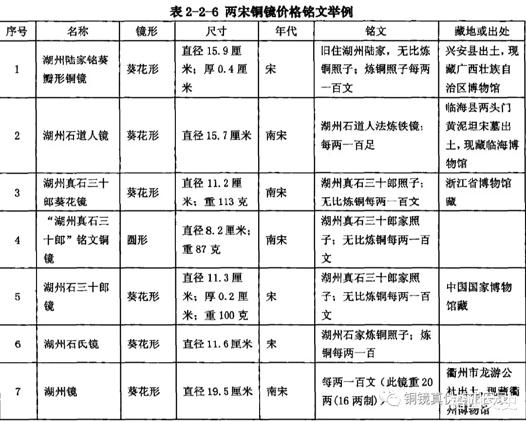 有一部分宋代铜镜标注了明确的售价,此多见于湖州镜。从铭文中可知宋代的铜镜是按重量计价,每两大概一百文左右(表2-2-6)。衢州博物馆藏有一面南宋湖州镜,铭文为“每两一百文”,按宋制此镜重20两,可知这面湖州镜的价格约为200文。据程民生考证,宋代下层人户一般每天收入数十文到100文不等,维持一个人一天最低生活的费用约需20文。普通居民全年所有花销,每人每天平均100文左右。可见宋代铜镜作为日常消费品,虽然已向平民化趋势发展,但仍然属于高价产品,一般下层民众很难能消费得起。