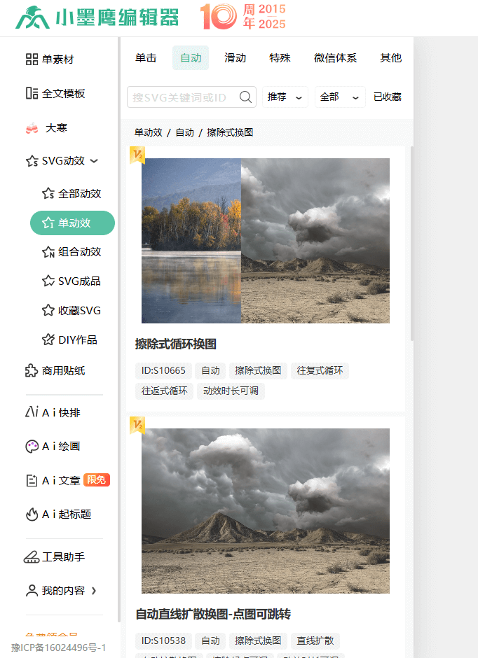 SVG动效素材的滑动效果,轻松替换图片或文字即可完成设置,无需了解复杂的技术细节。对于新手用户而言,这种傻瓜式操作堪称完美。此外,小墨鹰编辑器提供10万+公众号图文精美模板,并支持