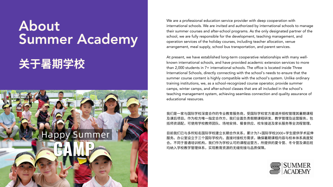 今年该校与经验丰富的Summer Academy合作,他们以提供卓越的夏令营项目而闻名,将共同努力,为孩子们打造一个充实且难忘的暑期体验。