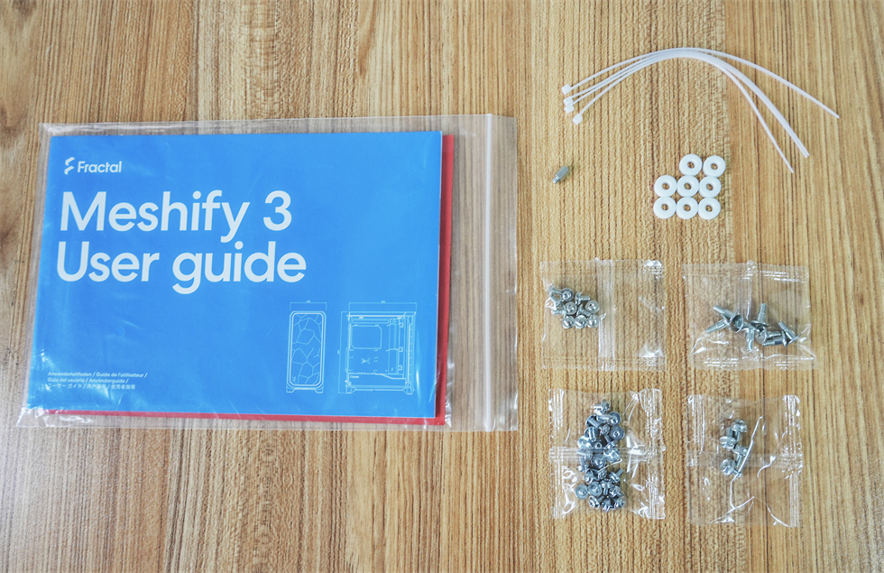 配件全家福,包括扎线带,胶垫、各种螺丝,说明书。
