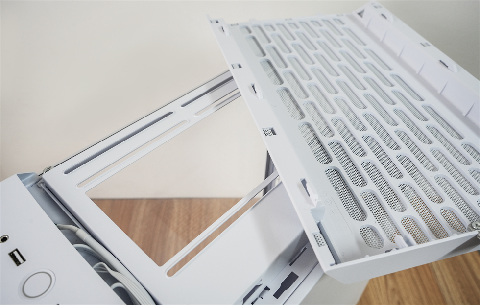 顶部是大面积的透气孔,IO面板位于顶部前端,由左至右依次是音频接口、USB Type-A接口(5Gbps)、电源开关、USB Type-A接口(5Gbps)和USB Type-C(20Gbps)接口。