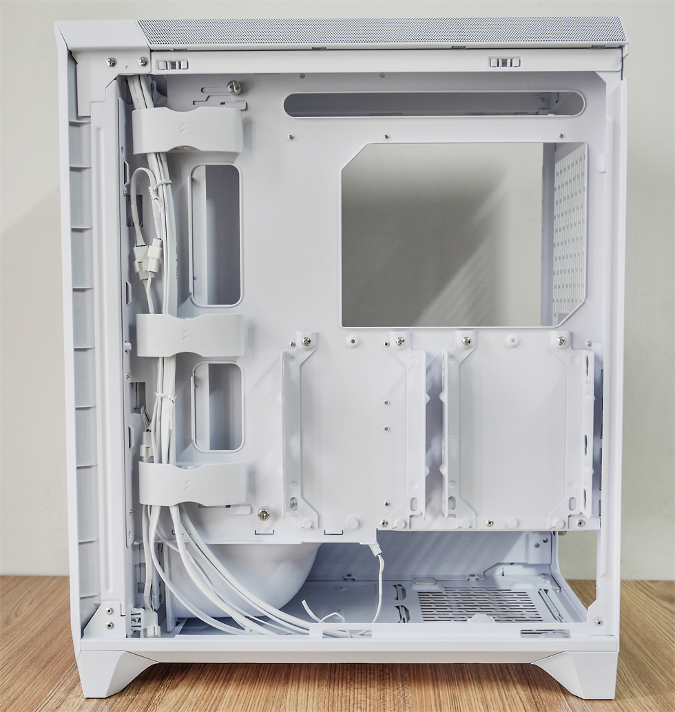 背面来一张,走线空间充裕,可以看到右侧也就是电源舱上方有两个硬盘固定架,可安装2块3.5英寸硬盘,分形工艺为走线美观设计了特殊的卡扣式理线器。不过因为气流导向设计,所以电源位略受影响,限长为180mm,好在现在很多厂商都出了小尺寸大功率的电源。