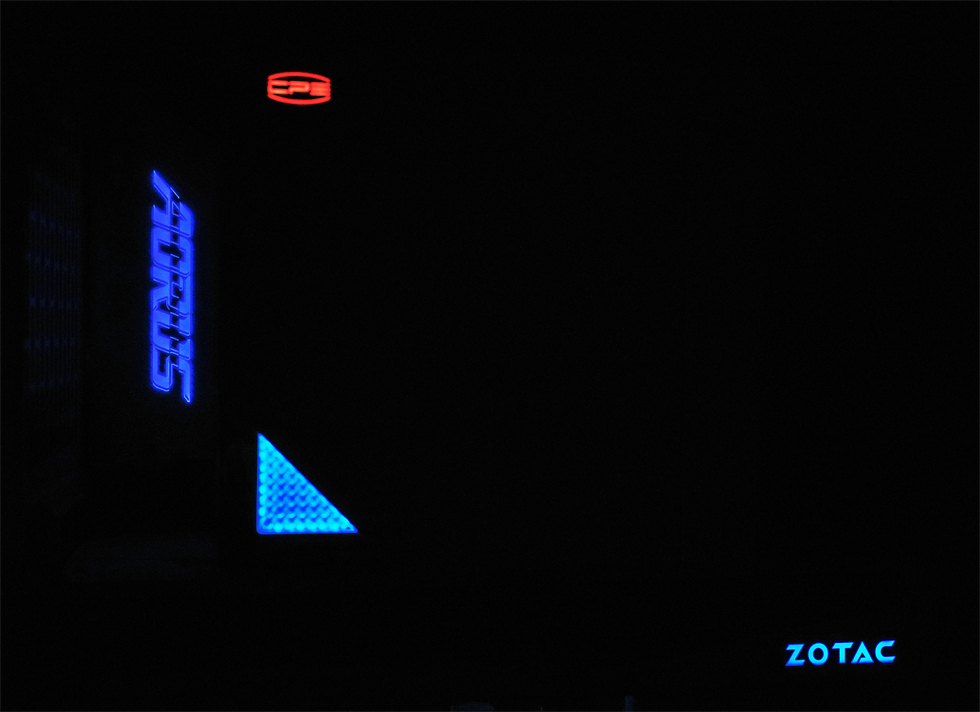 显卡散热罩线条相对柔美,这个角度能看到密集阵列散热鳍片,还能够看到冰脉3.0复合热管,电源接口已经是采用ATX 3.1规范的12V-2×6了,右侧的“ZOTAC”采用了ARGB设计,支持1600万色和多种灯效模式调节。