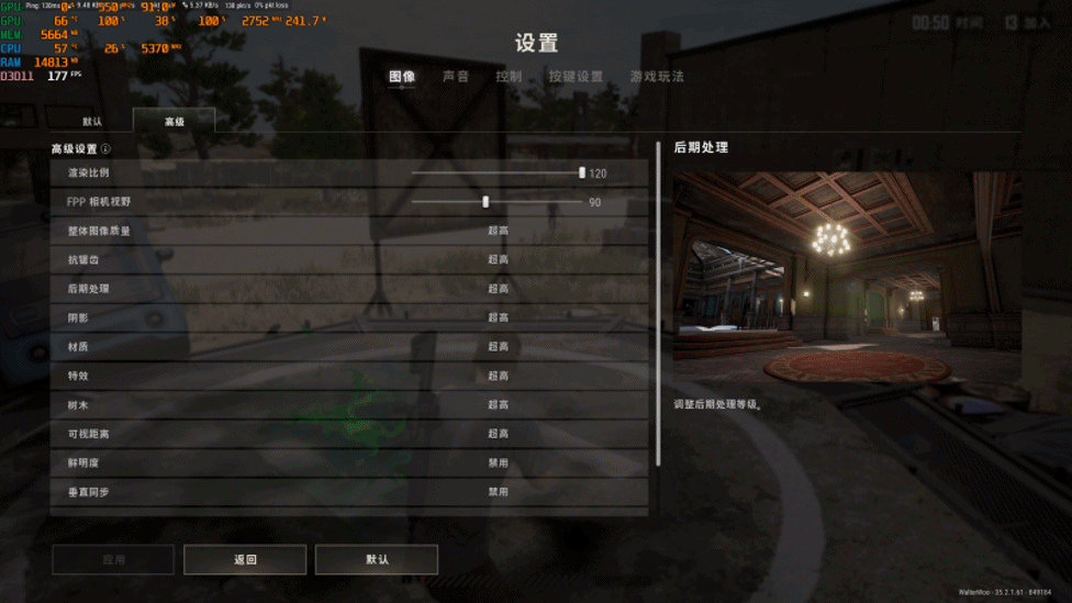 吃鸡设置如上图,渲染比例开到120,效果最高,2K分辨率,帧数在165-230浮动。