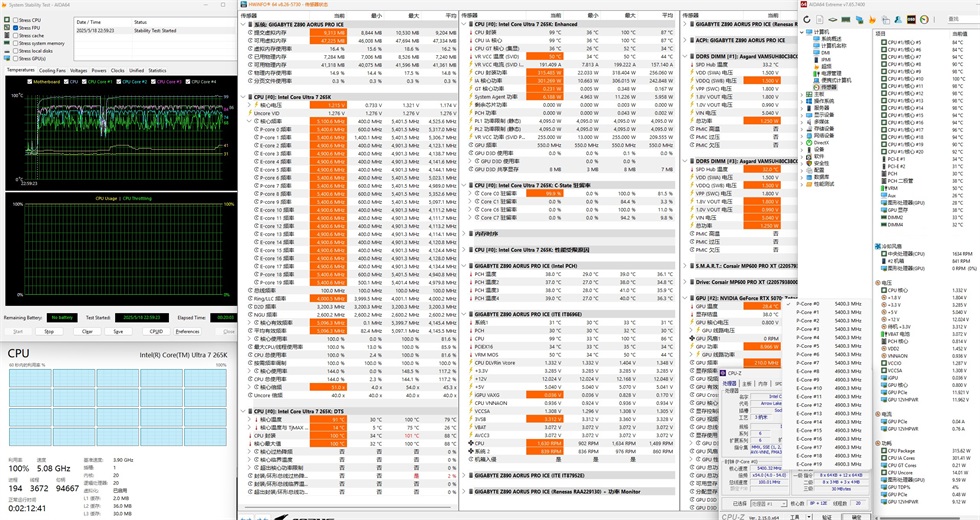 室温26℃,开启intel官方IPO设置,单烤FPU,跑了20分钟温度稳定——CPU温度80℃、CPU核心91℃、CPU封装100℃,CPU功耗稳定在315W左右,CPU供电1.33V左右,频率全核5400/4900MHz。进一步使用的话可以脱离官方IPO参数考虑降压超频,按我的经验来看,频率不变且温度还可以进一步下降,毕竟在开启IPO的测试过程中CPU功率就一直超出RZ820的官方290W散热极限。