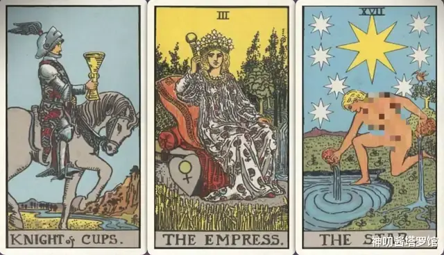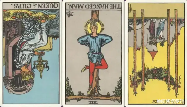 牌:圣杯皇后- 倒吊人- 权杖四-